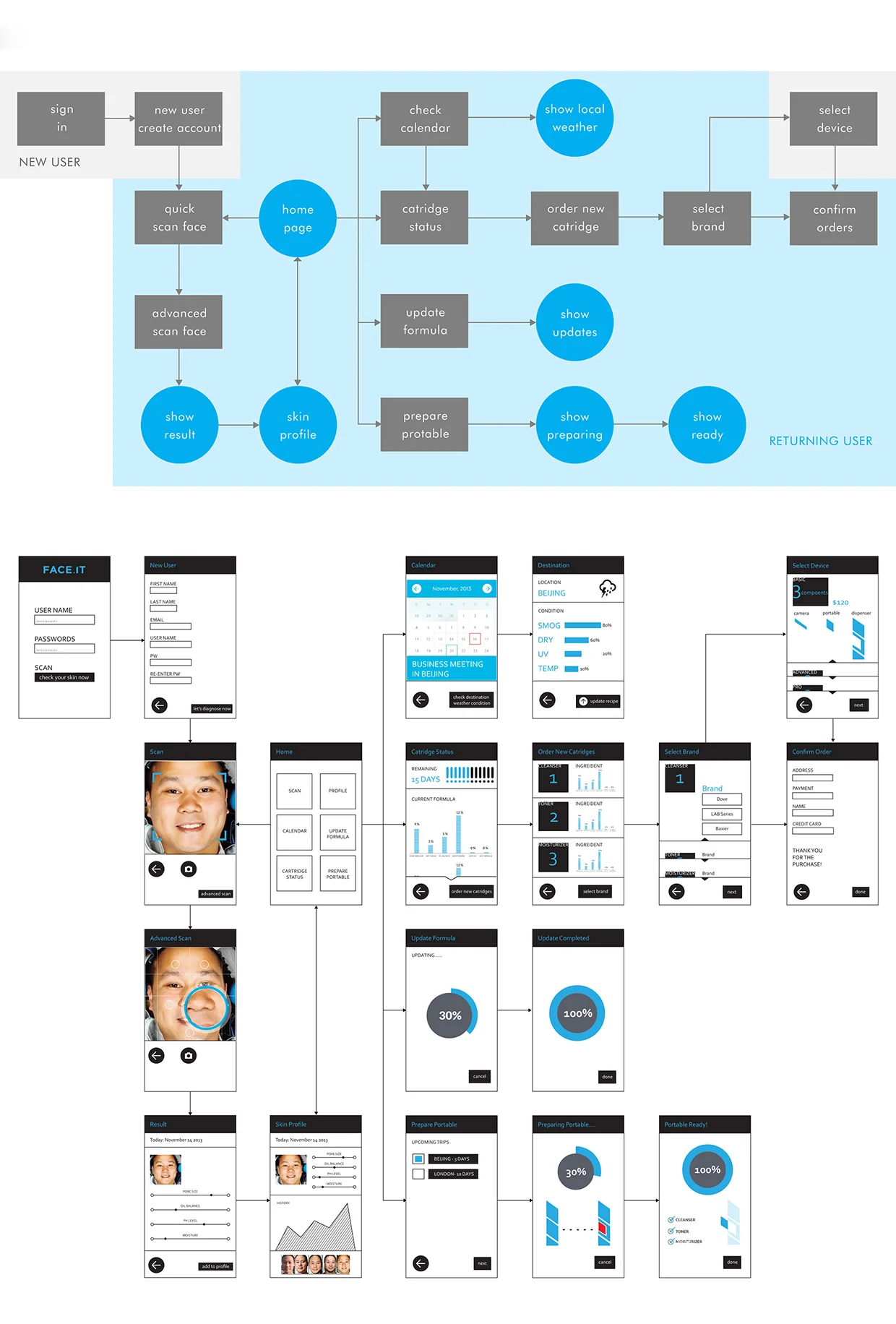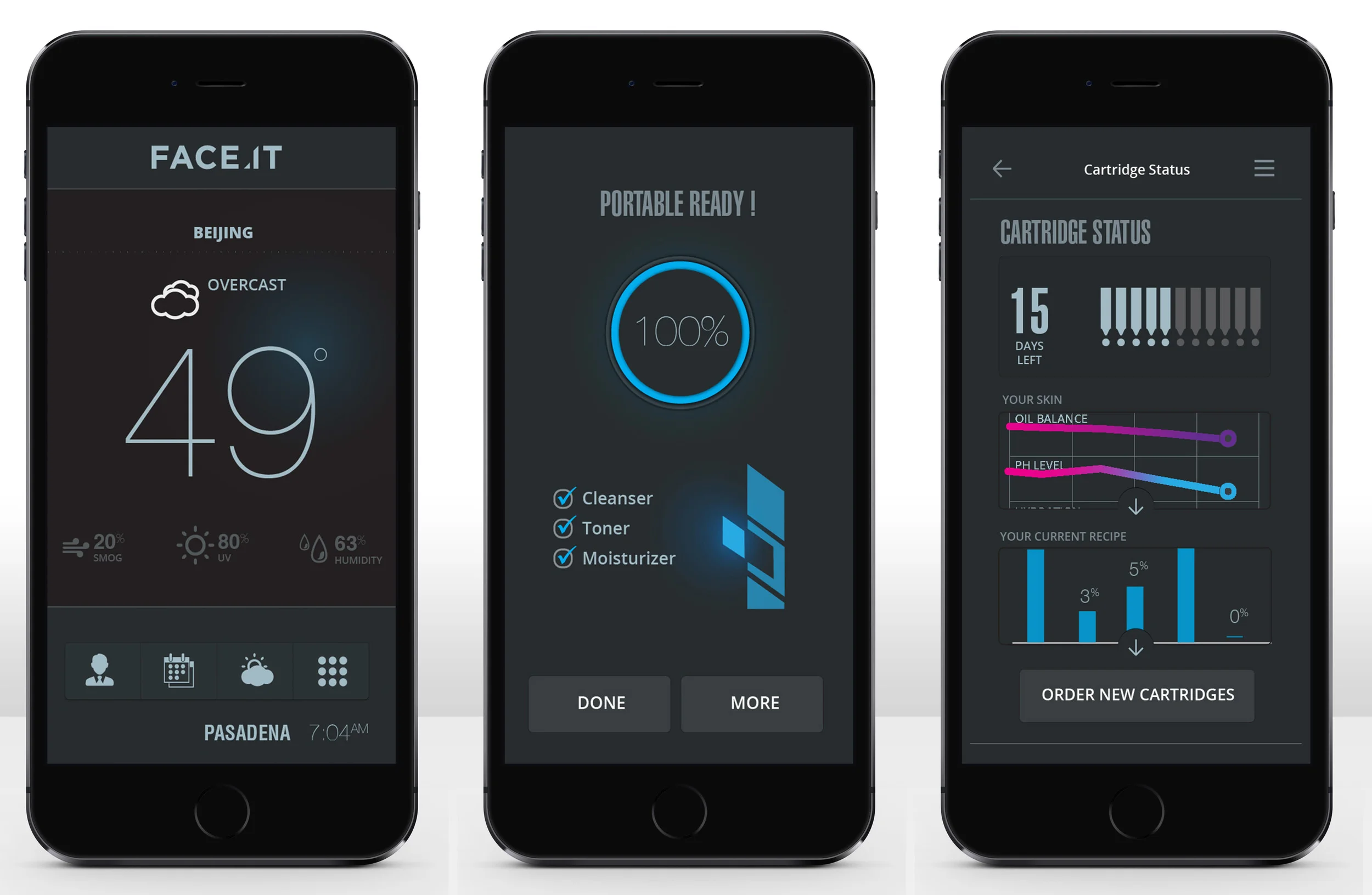 FACE.IT is a customizable facial care system for men complete with a dispenser, a camera that scans the face, and a mobile app that sets a personalized recipe daily based on data of the user’s skin and weather conditions.